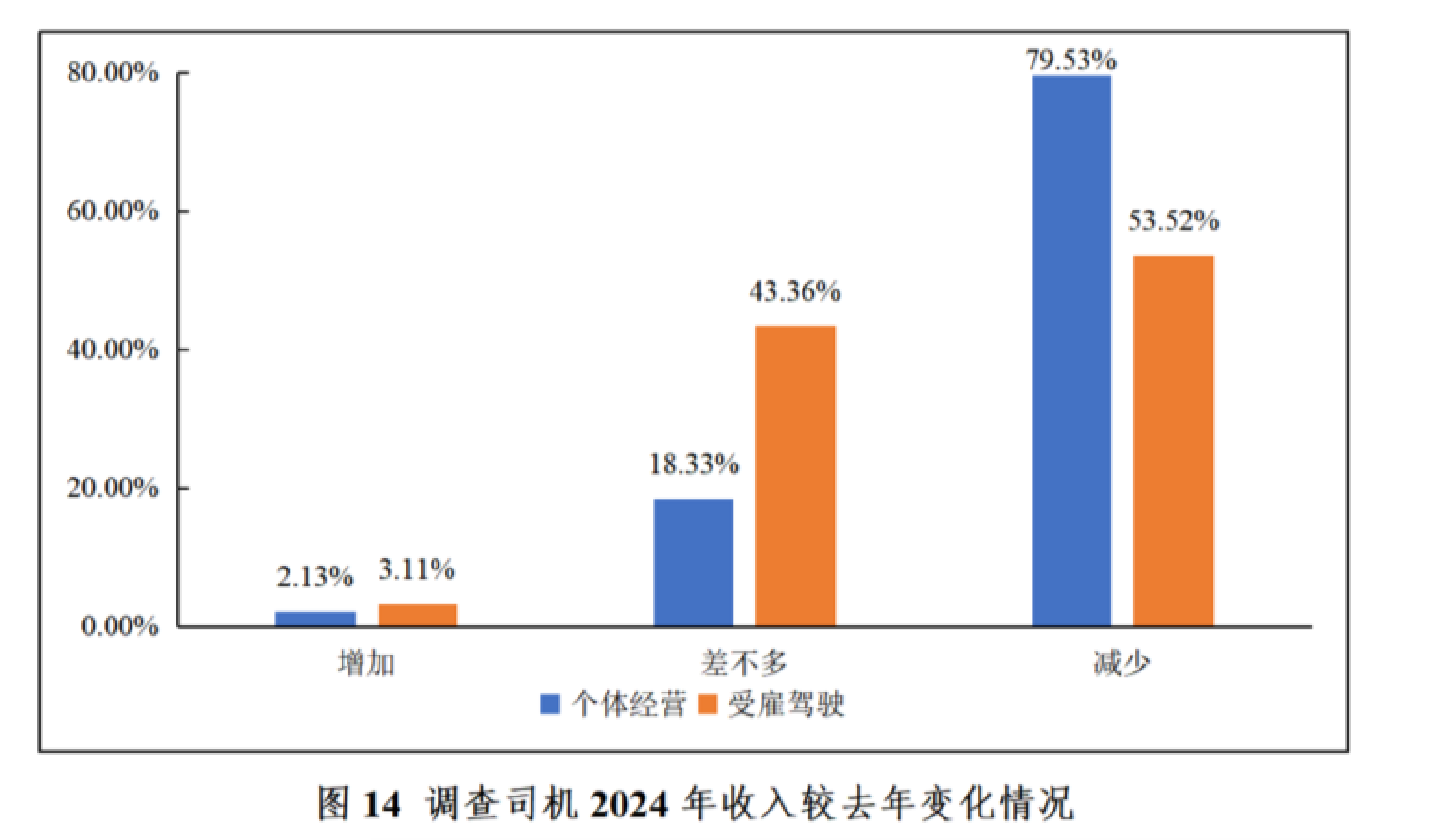 报告显示,货车司机普遍反映2024年整体收入较2023年出现下降。其中,个体经营司机反馈收入减少的接近八成,受雇驾驶司机在一半左右。