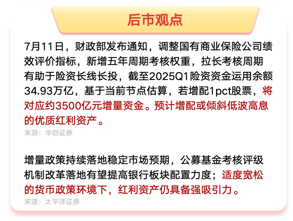 增量政策持续落地稳定市场预期,公募基金考核评级机制改革落地有望提高银行板块配置力度;适度宽松的货币政策环境下,红利资产仍具备强吸引力。
