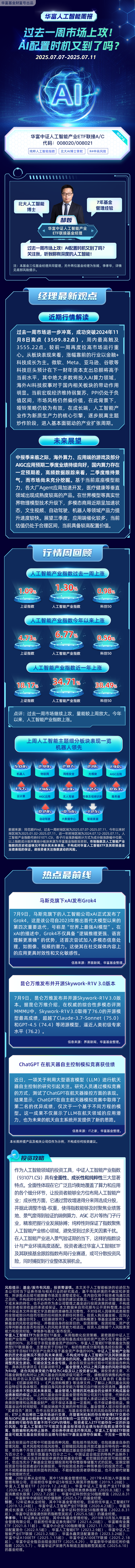 【行情速览】过去一周市场继续上攻,量能较上周放大。今年以来,人工智能产业指数上涨。(数据来源:同花顺iFind,过去一周时间区间为2025.06.30-2025.07.11,今年以来时间区间为2025.01.02-2025.07.11。人工智能产业指数的历史收益情况不预示其未来表现,不构成对华富人工智能ETF及其联接基金业绩表现的保证,请投资者关注指数波动的风险。)