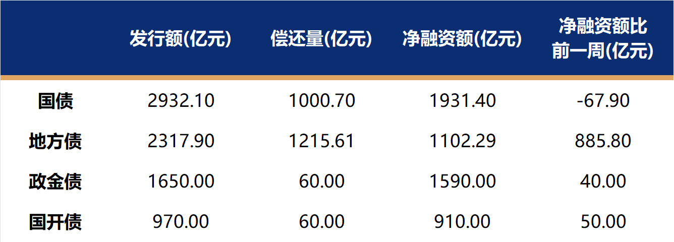 国债、国开、政金债、地方债发行量、偿还量、净融资额(与前一周比较)