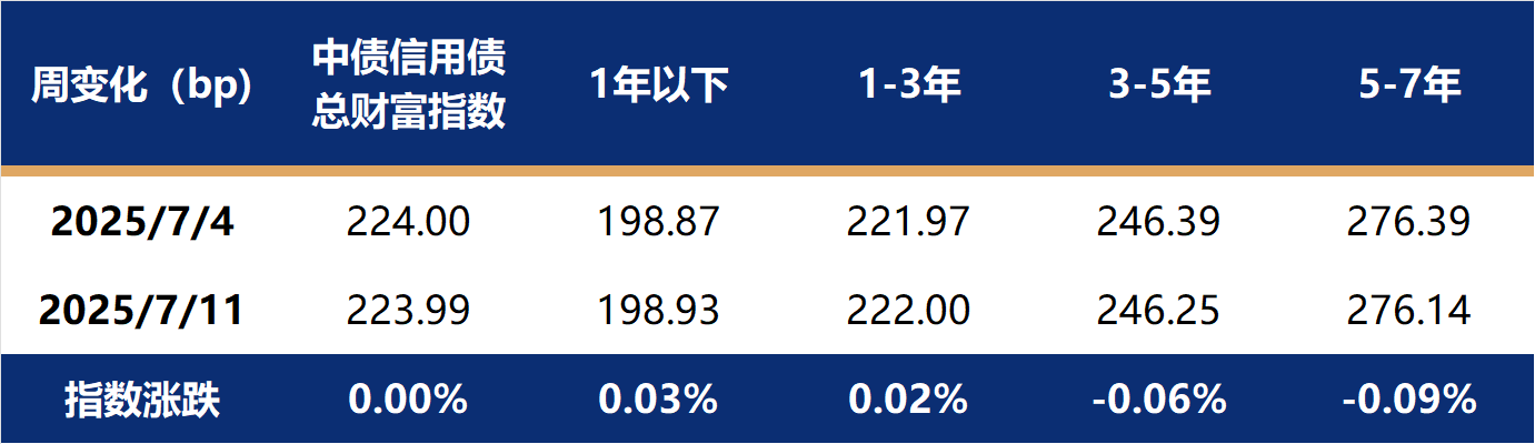 上周,信用债收益率小幅上行,上行幅度小于利率债。中债信用债总财富指数持平于前一周,其中5-7年、3-5年指数跌幅稍大。