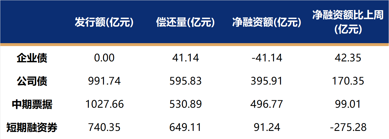 一级市场:非金融企业短融、中票、企业债、公司债发行量、偿还量、净融资额(与前一周比较)