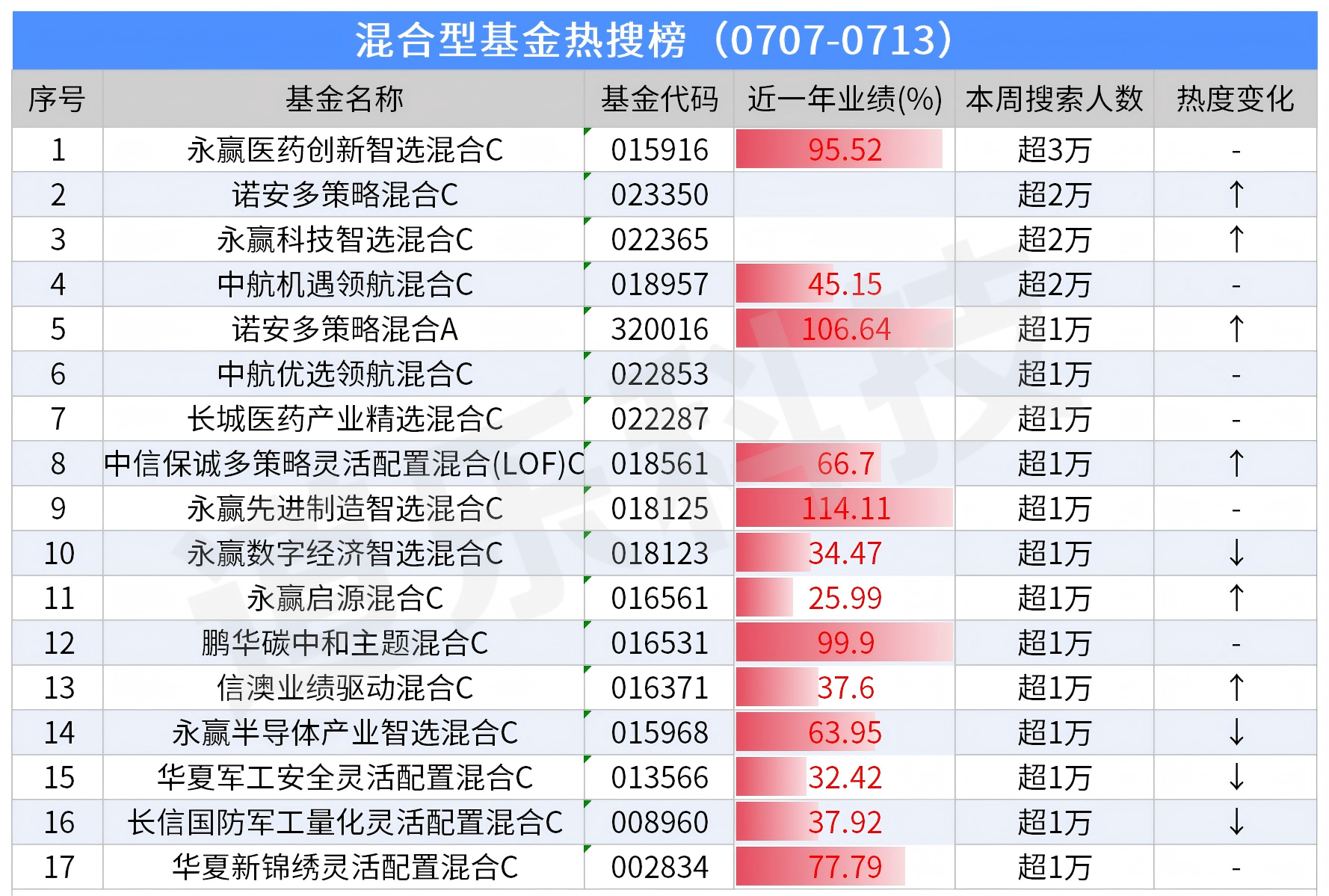 永赢基金:本周表现突出,共有 6 只混合型基金上榜(周搜索量均超 1 万),总热度累计超 9 万,凭借产品数量和整体热度优势领跑。