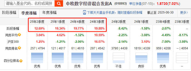 所以看业绩,“中欧数字经济”已经连续4个季度实现2位数收益,近1年涨了115.8%,是当下比较罕见的翻倍基。