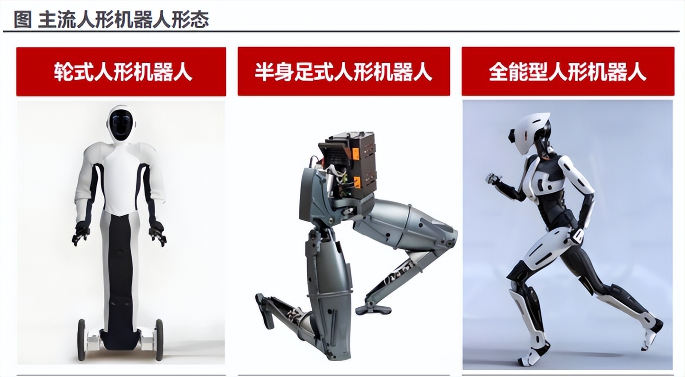 人形机器人按形态可以分为轮式、半身足式和全能型人形机器人。