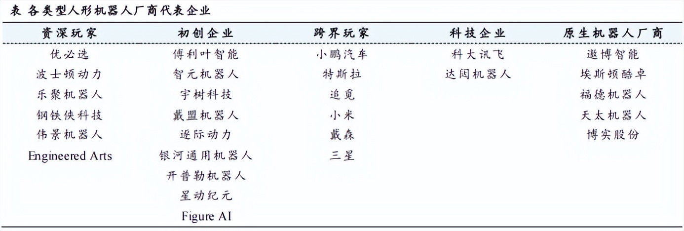 初创企业:根据最新消息,宇树科技目前已启动上市辅导,代表产品有机器狗和人形机器人,其中人形机器人最早于2023年推出。