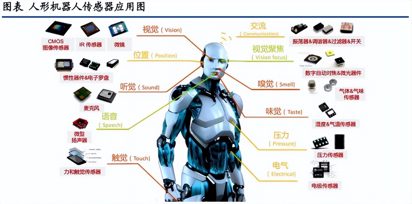 虽然执行器整体占据了人形机器人的主要成本,但传感器系统作为人形机器人的电子皮肤和五官,同样必不可少,被广泛应用于执行器、头部及脚部。