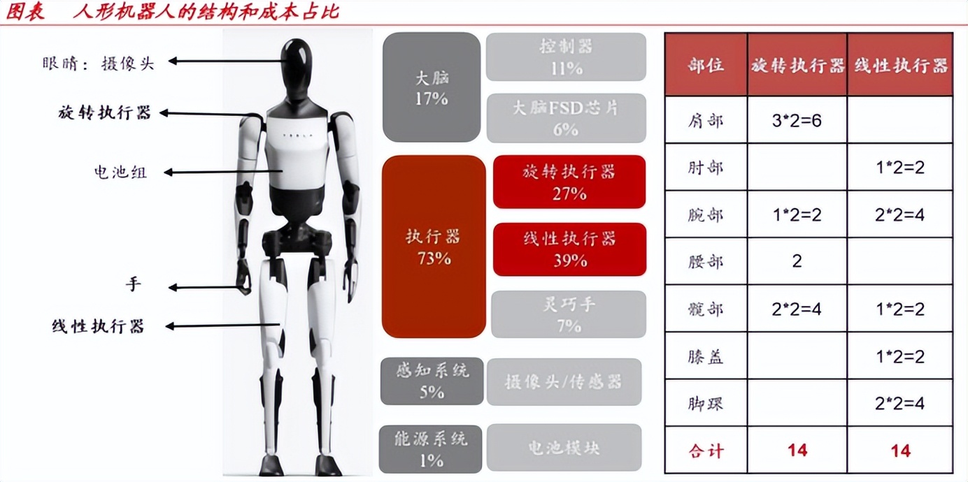 那么按功能不同,我们将零部件分为3大类:主导运动的执行器(包括旋转执行器、线性执行器和灵巧手),以传感器为核心的感知系统,还有“大脑”控制系统。