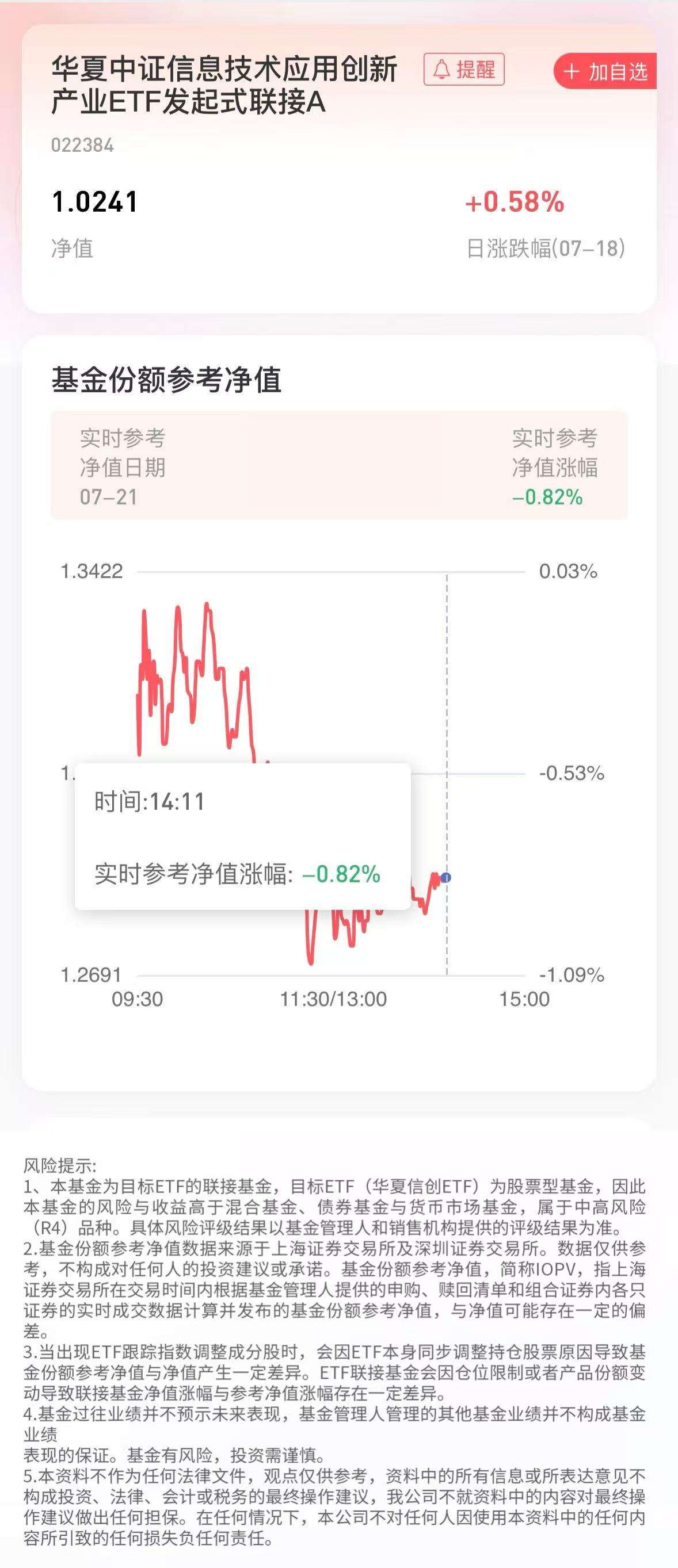 截止至2025年7月21日14:11,本基金跟踪目标基金的实时参考净值涨幅为-0.82%。