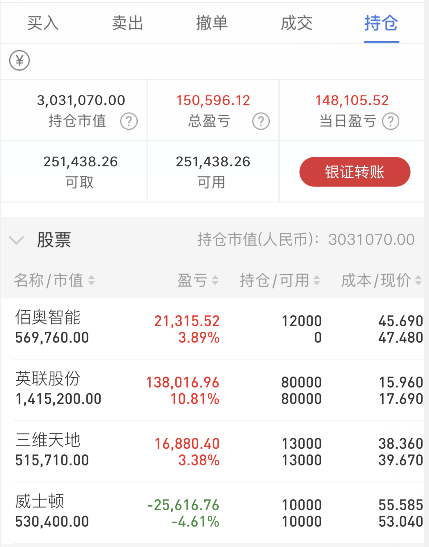 第一个交易日!花姐是一个普通的股民,做好自己,大家共同探索提高,大家一起切磋!今日情况做下总结。首先上周五入的英联股份。其形态良好,沿 5 日线上扬中,今日量能有所放大。开盘震震荡荡,差点被洗出去。随后震荡走高,今日表现非常哇塞。三维天地拿了有一段时间了,来来回回坐电梯,今日总算硬起来了。继续继续在的。互联网金融威斯顿比较疲软,今日表现也是比较木讷。近期金融、互联网金融走势不太乐观,威斯顿继续坚守中。今天的新秀,佰奥智能高位追进去的,期待明日有精彩的表现。
