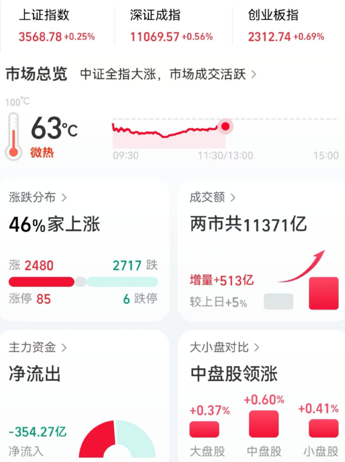 午评:三大指数全面拉升,午间收盘上证涨0.25% 深成指涨0.56% 创指收涨0.69% 沪深两市半日成交11371亿,较上个交易日增量513亿。个股跌多涨少,两市2480只个股翻红,2717只个股收绿