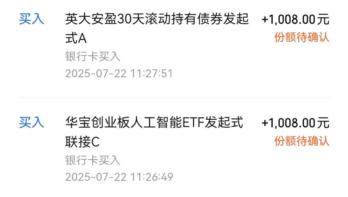$英大安盈30天滚动持有债券发起式A(OTCFUND|014511)$ 个人买入1008元