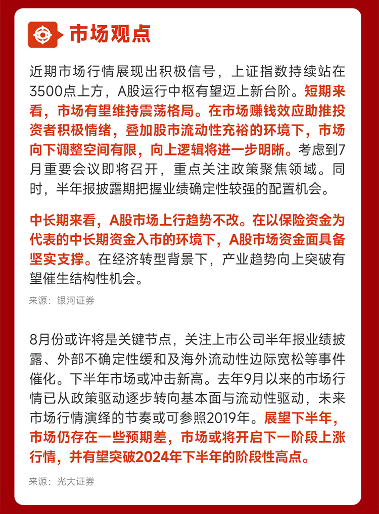 8月份或许将是关键节点,关注上市公司半年报业绩披露、外部不确定性缓和及海外流动性边际宽松等事件催化。下半年市场或冲击新高。去年9月以来的市场行情已从政策驱动逐步转向基本面与流动性驱动,未来市场行情演绎的节奏或可参照2019年。展望下半年市场仍存在一些预期差,市场或将开启下一阶段上涨行情,并有望突破2024年下半年的阶段性高点。