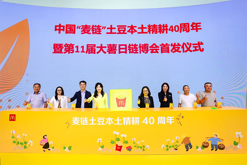 (2025年7月18日,北京)麦当劳中国携手薯条供应商辛普劳中国、麦肯中国与蓝威斯顿中国,以及土豆种植农户代表,在第三届中国国际供应链促进博览会(以下简称“链博会”)麦当劳展台共同庆祝土豆本土种植40周年,并首发第十一届“大薯日”主题活动。40年来,麦当劳与供应商伙伴共同构筑中国“麦链”扎根中国、深耕本土化发展。今年大薯日麦当劳中国将继续围绕经典产品大薯,展现土豆“从农场到餐桌”的过程,将麦当劳薯条背后的品质及趣味故事传递给更多消费者。