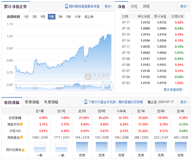 短期爆发力突出。2025年Q1净值增长17.91%,大幅跑赢业绩基准(中证新兴产业指数×65%+债券指数×35%)18.9个百分点。2025年上半年累计收益28.83%,同类排名前15%(灵活配置型基金)。近一年累计收益35.62%(截至2025年7月18日)。