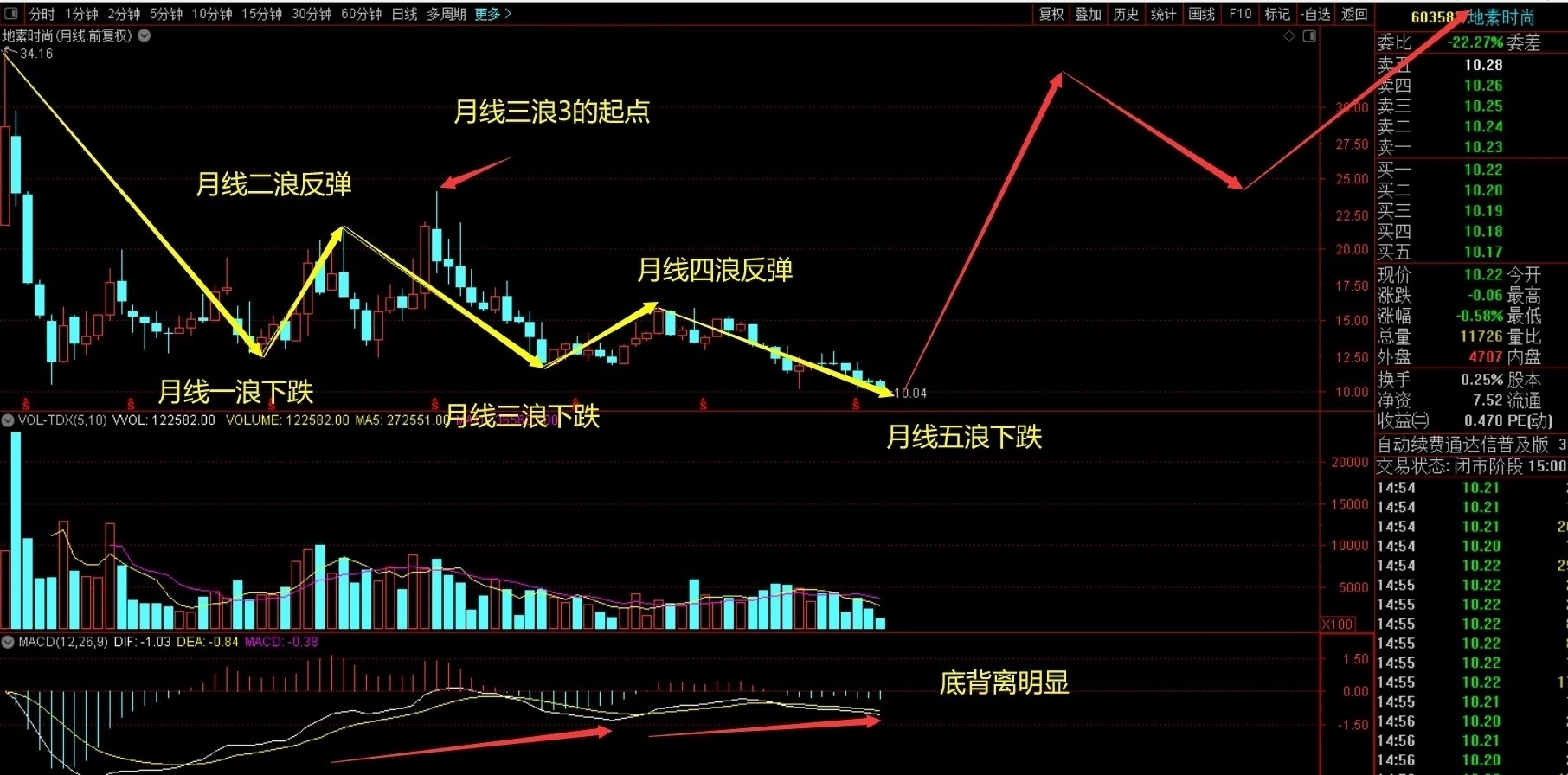 技术面:月线五浪下跌,周线五浪下跌,日线五浪下跌,都已经出现背离,月线上涨趋势要开启了,对于大资金来说这是好消息