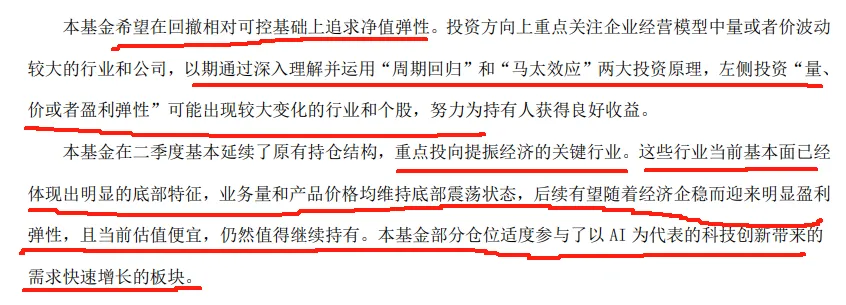 本基金在二季度基本延续了原有持仓结构,重点投向提振经济的关键行业。这些行业当前基本面已经体现出明显的底部特征,业务量和产品价格均维持底部震荡状态,后续有望随着经济企稳而迎来明显盈利弹性,且当前估值便宜,仍然值得继续持有。本基金部分仓位适度参与了以 AI 为代表的科技创新带来的需求快速增长的板块。