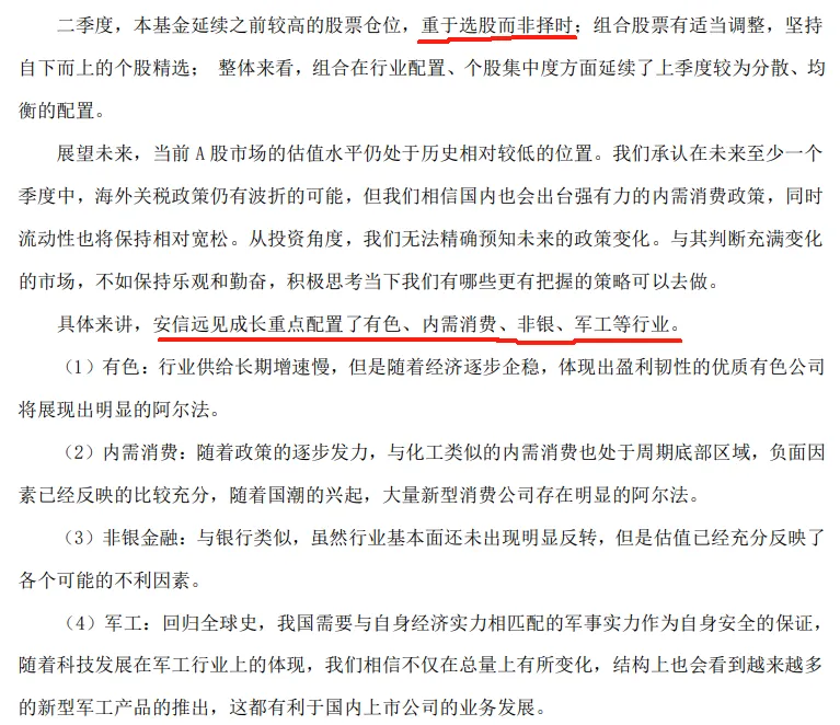 安信远见成长重点配置了有色、内需消费、非银、军工等行业。