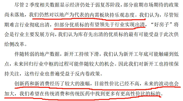 尽管2季度相关数据显示经济仍处于弱复苏阶段,部分前期市场期待的政策尚未落地,我们仍然对以地产为代表的内需板块持乐观态度。部分优质标的有望领先于行业实现出清,