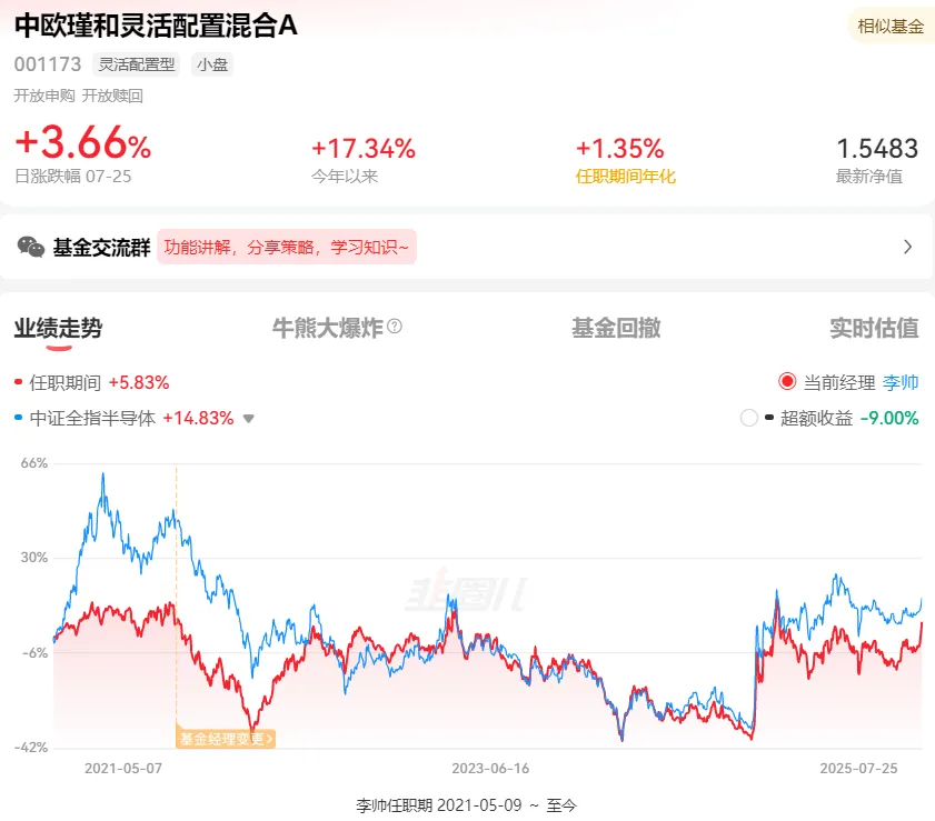 中欧基金李帅重仓半导体。但相对中证全指半导体表现不突出。