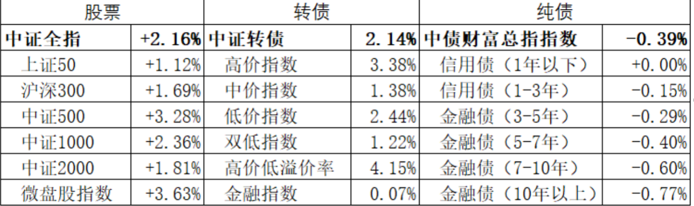 上周股涨债跌。具体来看,股票市场延续强势,沪指周线五连阳,成交量明显放大。债券出现明显下跌,长端率先松动带动短端走弱。转债市场明显上涨,成交量明显放大。