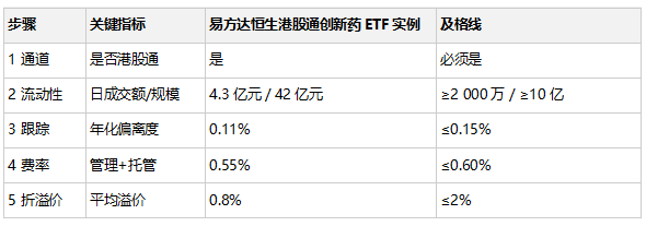 把日成交额<2 000 万元或规模<10 亿元的直接删掉,盘中挂单深度不足,买卖价差会吃人。Wind 截至 2025/7/28 的数据显示,易方达恒生港股通创新药ETF日均成交 4.3 亿元,规模 42 亿元,过关。