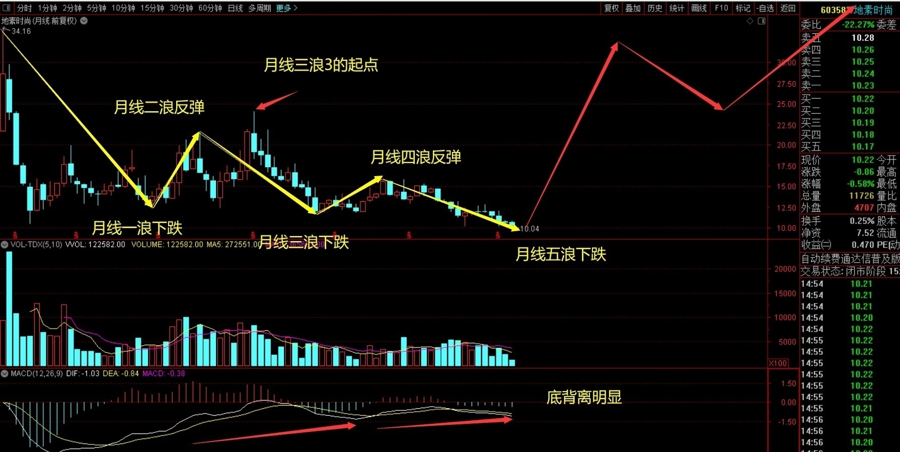 技术面:月线五浪下跌,周线五浪下跌,日线五浪下跌,都已经出现背离,月线上涨趋势要开启了,对于大资金来说这是好消息