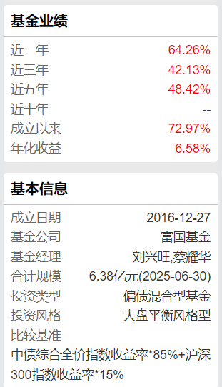 公开信息显示,截至2025.07.30,这只基金近1年、3年、5年收益分别为:64.26%,42.13%、48.42%;成立以来累计净值增长72.97%,年化收益6.58%,整体表现可谓可圈可点。
