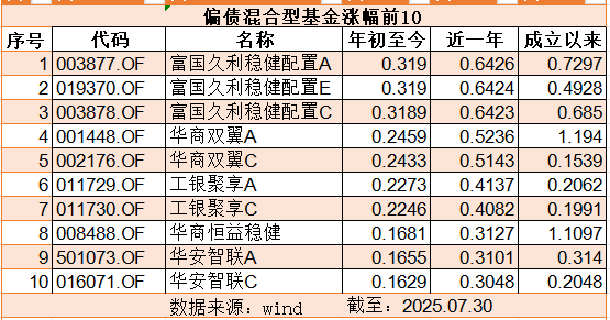 Wind数据显示,截至2025年7月30日(下同),今年以来1377只偏债混合型开放式基金中,涨幅前10的产品,最高收益超过30%,最低收益也高达16.29%,远远跑赢沪深300指数同期5.5%的涨幅。