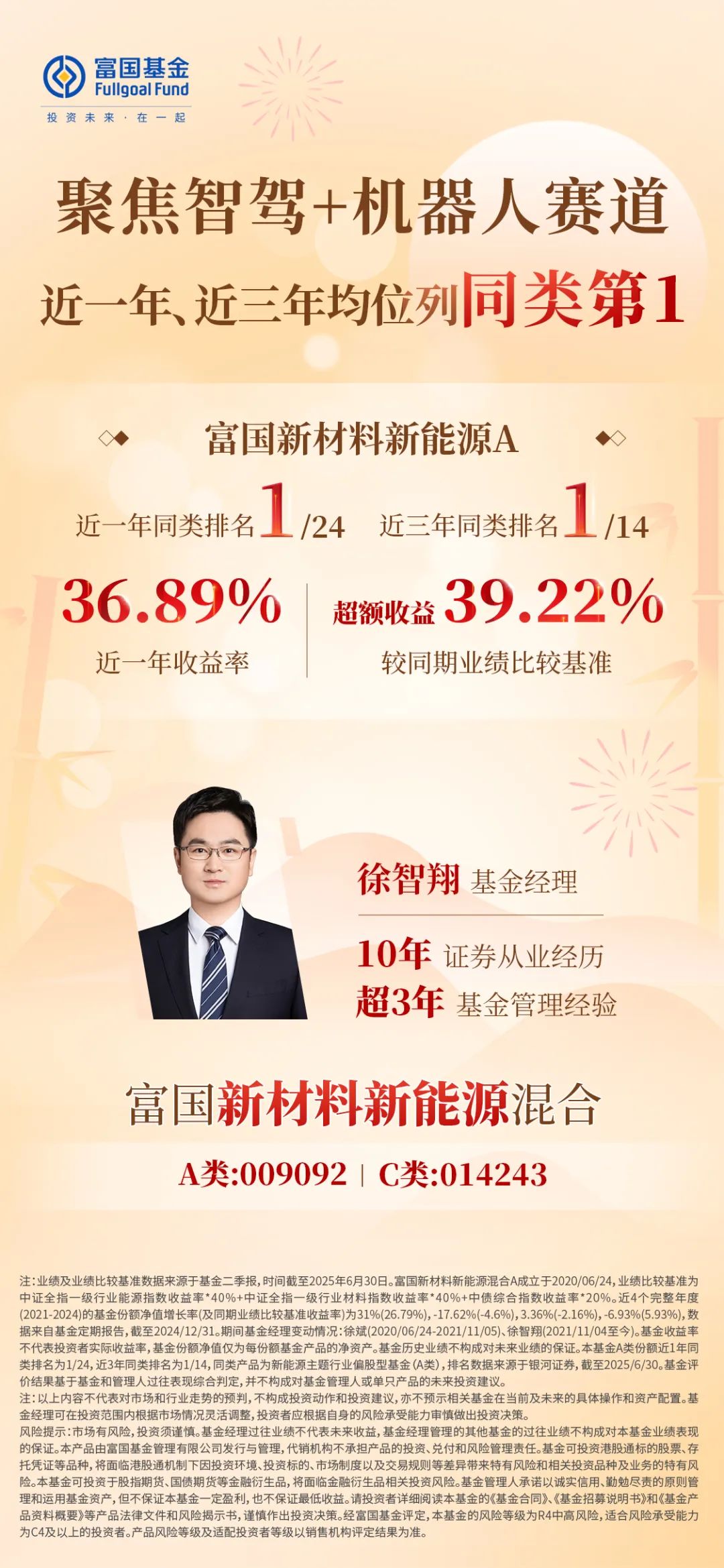 注:业绩及业绩比较基准数据来源于基金二季报,时间截至2025年6月30日。富国新材料新能源混合A成立于2020/06/24,业绩比较基准为中证全指一级行业能源指数收益率*40%+中证全指一级行业材料指数收益率*40%+中债综合指数收益率*20%。近4个完整年度(2021-2024)的基金份额净值增长率(及同期业绩比较基准收益率)为31%(26,79%6),-17.62%(-4.6%),3.36%(-2.16%),-6.93%(5.93%),数据来自基金定期报告,截至2024/12/31。期间基金经理变动情况:徐斌(2020/06/24-2021/11/05)、徐智翔(2021/11/04至今)。基金收益率不代表投资者实际收益率,基金份额净值仅为每份额基金产品的净资产。基金历史业绩不构成对未来业绩的保证。本基金A类份额近1年同类排名为1/24,近3年同类排名为1/14,同类产品为新能源主题行业偏股型基金(A类),排名数据来源于银河证券,截至2025/6/30。基金评价结果基于基金和管理人过往表现综合判定,并不构成对基金管理人或单只产品的未来投资建议。