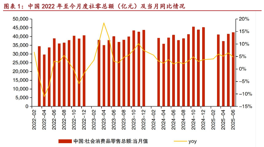 消费、投资、出口,是拉动经济的三驾马车。在提振内需的大背景下,政策端率先发力。2024年年末,重要会议将“大力提振消费、提高投资效益,全方位扩大国内需求”列为2025年经济工作的首要任务。2025年3月,《提振消费专项行动方案》印发,政策从供需两端发力,强调为居民增收减负,同时覆盖传统消费和新型消费。在促消费政策加力拉动下,社零增速同比回升。据统计局数据,2025年1-6月,社零总额累计为24.5万亿元,同比增长5.0%。
