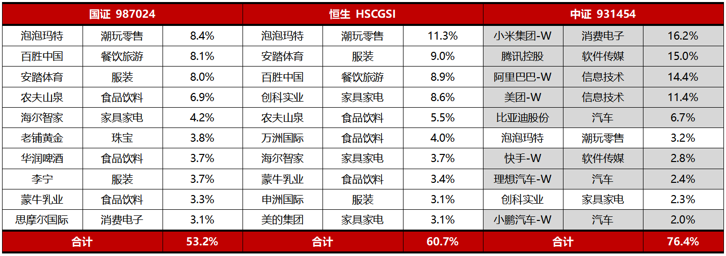 这一点从指数的前十大成分股也可见一斑。截至6月30日,港股通消费50ETF(159268)标的指数(国证)的第一大重仓股是“潮玩顶流”泡泡玛特,而中证的则是偏互联网属性的小米集团。此外,有“黄金届奢侈品”之称的老铺黄金是国证的第六大权重股,占比较恒生、中证明显更高。