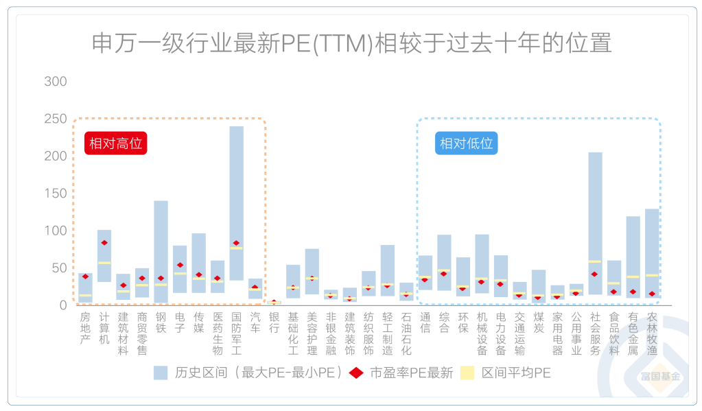 相对低位:农林牧渔、有色金属、食品饮料、社会服务、公用事业等。