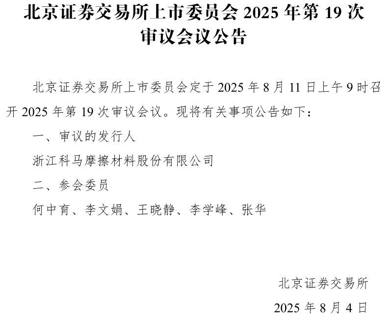 2025年8月4日晚,北交所公告了今年第19次发审会:科马材料将于2025年8月11日上会。已经连续两周都是一周两会,那么一周双发还会远吗?