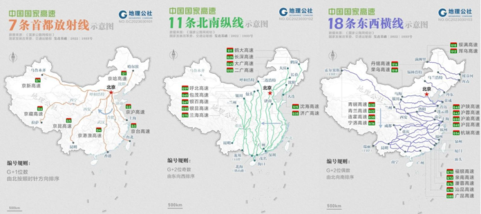 《国家公路网规划(2013年—2030年)》明确,国家高速公路网由“7射(即京X线,编号G1到G7,配属联络线/并行线编号为G0Xyy)、11纵(编号为GXX(奇数),配属联络线/并行线编号GXXyy)、18横(编号为GXX(偶数),配属联络线/并行线编号GXXyy)”(以下简称“71118”)等路线组成,总规模约13.6万公里;普通国道网由“12射、47纵、60横”等路线组成,总规模约26.5万公里。截至2021年底,国家高速公路建成12.4万公里,基本覆盖地级行政中心;普通国道通车里程达到25.8万公里。