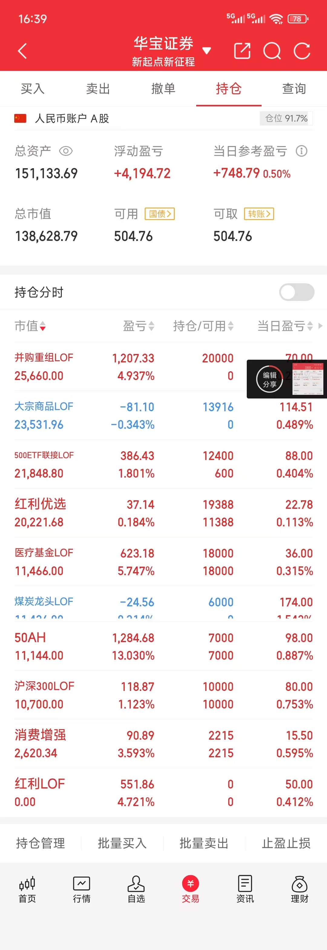 目前几乎全部持有跟踪A股指数的LOF基金,每天其实不太看盘、不太有操作的冲动了,这是好事。
