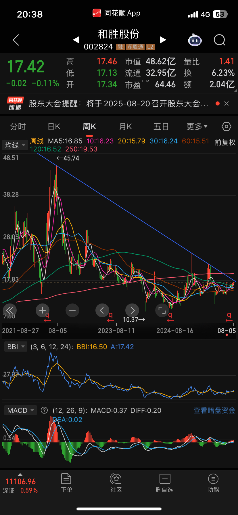 和胜股份周线级别大周期下降趋势线突破,macd进入水上,看看能否有效突破 ,如有效突破可以看趋势反转;短期而言是近一个月整理平台突破,按1:1 比例,短期可达18.3; 如果大周期反转,有望到25以上;
