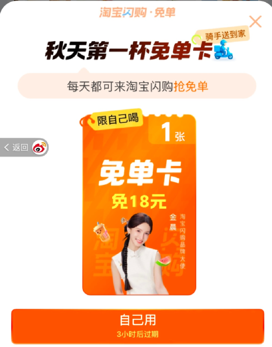 不少网友晒图称,抢到了淘宝闪购免单卡,喝到了“秋天的第一杯奶茶”。