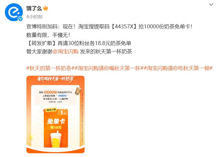 今天上午,饿了么官方微博曾发文称:“官博特别加码:现在,淘宝搜提取码【44357X】抢10000份奶茶免单卡。数量有限,手慢无!”