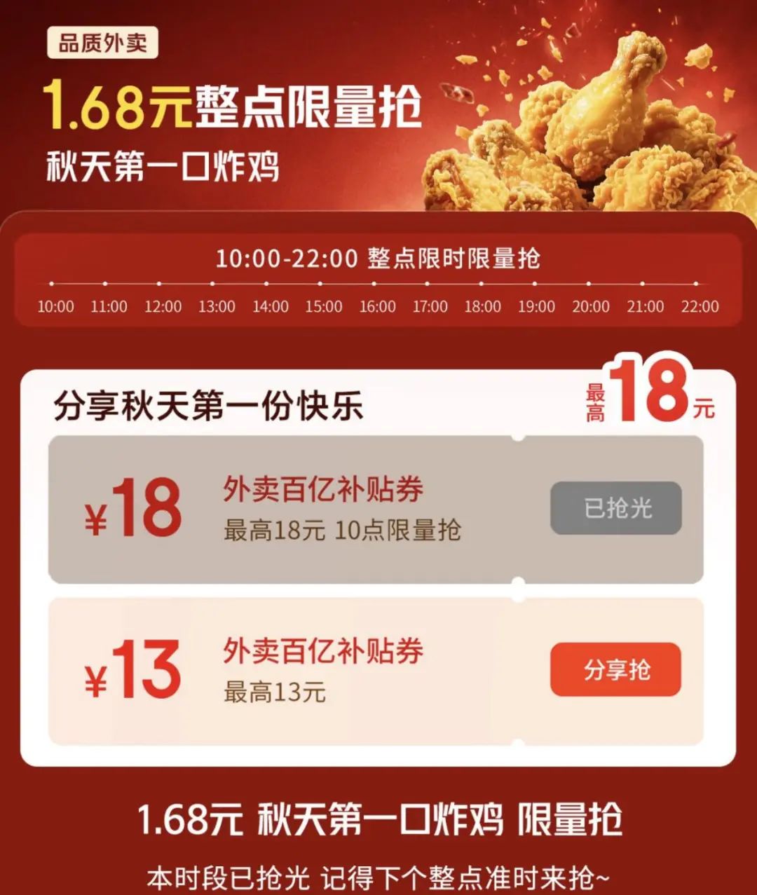 而京东另辟蹊径,推出“秋天的第一口炸鸡”活动,整点限量抢外卖百亿补贴券。