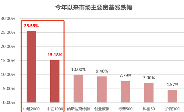 今年以来市场主题热点四处开花,比起单押赛道,分散投资的宽基策略或许更容易捕捉上涨红利。截至8月7日,年初至今以中证2000指数、中证1000指数为代表的小盘风格表现明显好于大中盘,甚至跑赢美股主流指数。