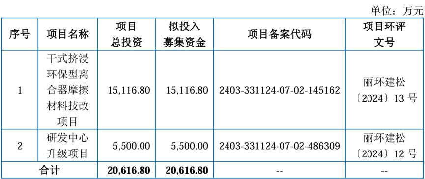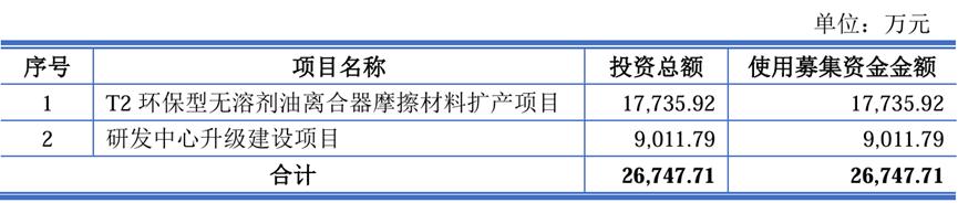 公司本次募集资金投资项目包括“干式挤浸环保型离合器摩擦材料技改项目”及“研发中心升级项目”,拟投入募集资金2.06亿元。