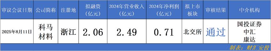 8月11日,北交所公告,上市委员会2025年第19次审议会议于2025年8月11日上午召开,审议结果浙江科马摩擦材料股份有限公司符合发行条件、上市条件和信息披露要求。
