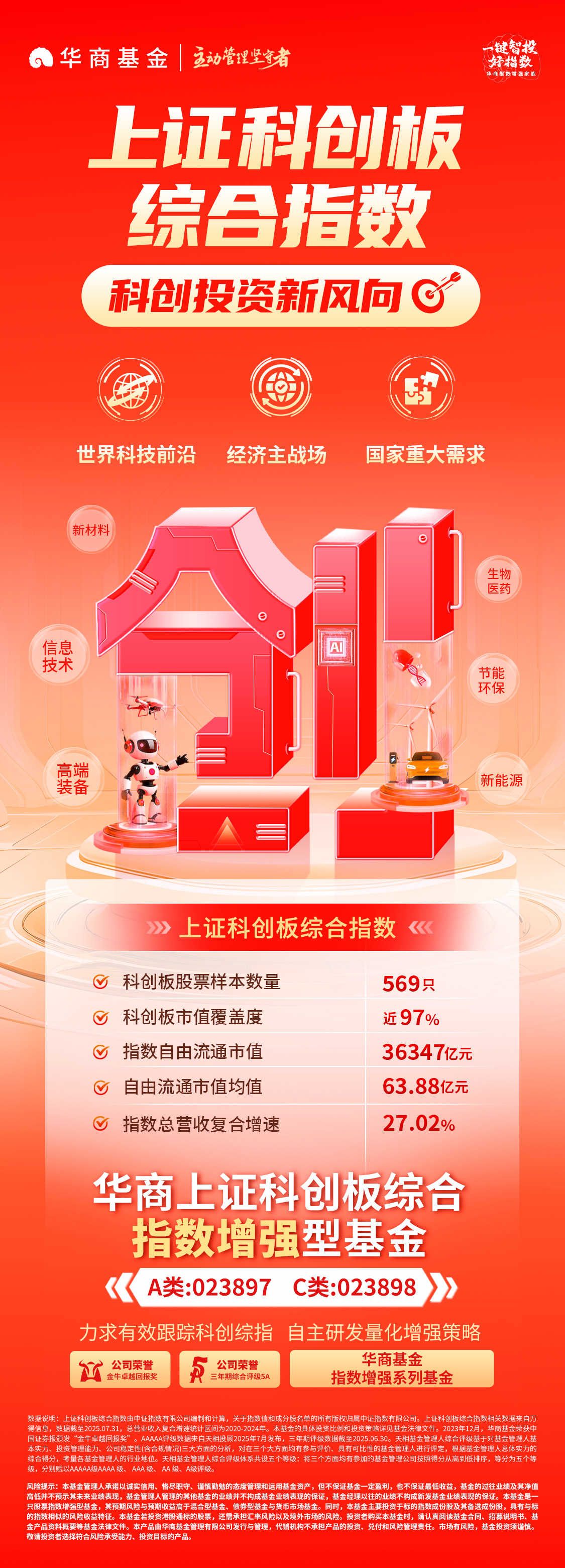 风险提示:基金管理人承诺以诚实信用、恪尽职守、谨慎勤勉的态度管理和运用基金资产,但不保证基金一定盈利,也不保证最低收益,基金的过往业绩及其净值高低并不预示其未来业绩表现,基金管理人管理的其他基金的业绩并不构成基金业绩表现的保证,基金经理以往的业绩不构成新发基金业绩表现的保证。华商上证科创板综合指数增强基金是一只股票指数增强型基金,其预期风险与预期收益高于混合型基金、债券型基金与货币市场基金。同时,基金主要投资于标的指数成份股及其备选成份股,具有与标的指数相似的风险收益特征。基金若投资港股通标的股票,还需承担汇率风险以及境外市场的风险。投资者购买本基金时,请认真阅读基金合同、招募说明书、基金产品资料概要等基金法律文件。以上不代表投资建议,市场有风险,基金投资须谨慎。敬请投资者选择符合风险承受能力、投资目标的产品。