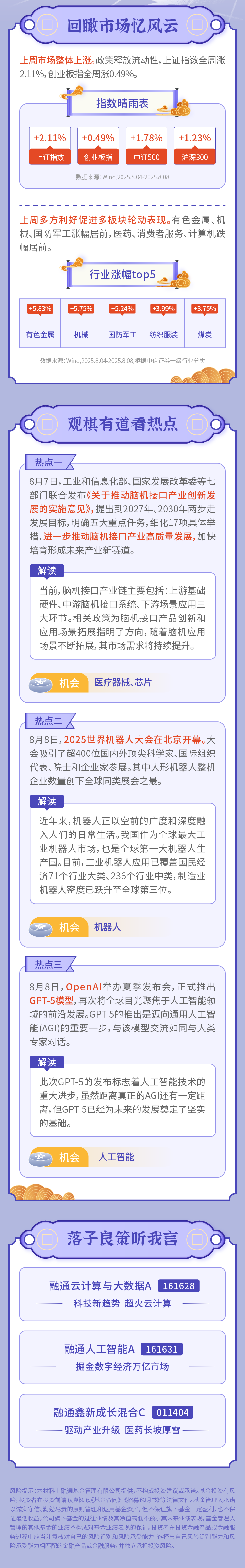 上周市场整体上涨。政策释放流动性,上证指数全周涨2.11%,创业板指全周涨0.49%。上周多方利好促进多板块轮动表现。有色金属、机械、国防军工涨幅居前,医药、消费者服务、计算机跌幅居前。