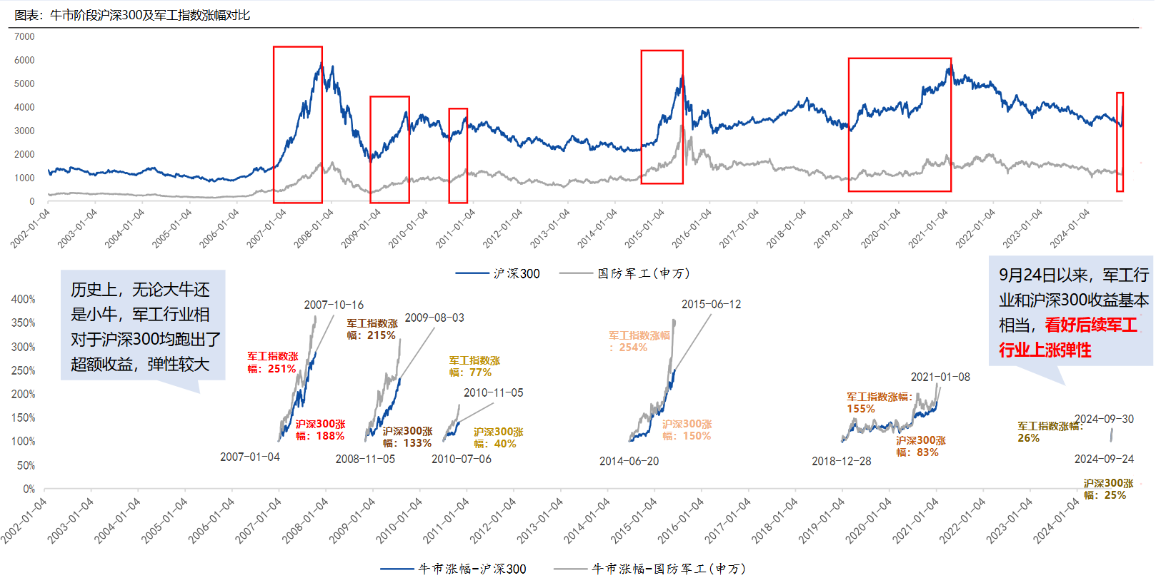 在业绩表现方面,根据中邮证券统计,120家军工行业上市公司中37家披露的2025H1业绩预告。按预告业绩的中值来看,14家上市公司预告业绩为正且实现同比增长我们回顾A股历次行情,会发现一个规律,那就是在牛市环境中军工行业往往能较同期沪深300跑出一定超额收益,24年的924行情之后,A股迎来一波大涨,根据wind数据,2024年9月24日-2025年8月11日期间,国防军工指数大涨43.12%,同期沪深300指数涨幅24.12%。
