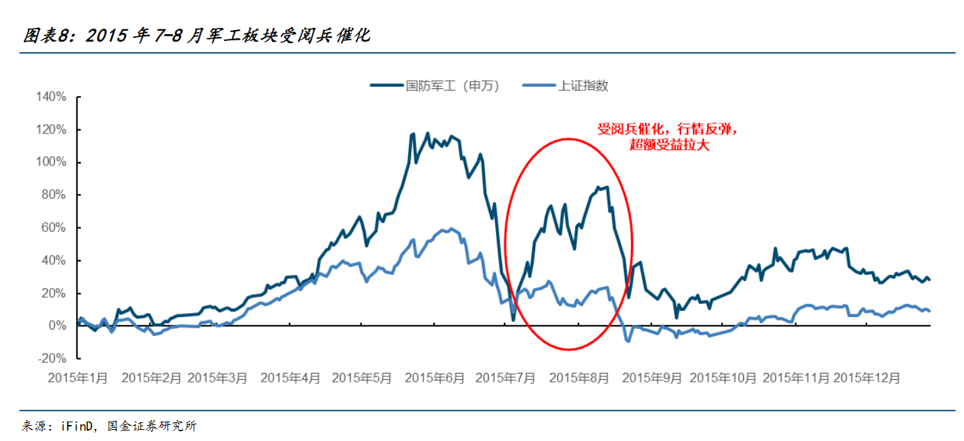 短期催化因素方面,2025年阅兵也对军工板块行情形成利好。2015 年 7 月 9 日起军工板块受阅兵的催化,该轮行情正式启动,并在 2015 年 8 月 17 日达到最高点,结束于 2015 年 8 月底,区间最大绝对收益 84.8%、最大超额收益 62.6%。2015 年全年,军工指数绝对收益为 28.5%,超额收益为 19.1%。未来一段时间,军工板块或持续受益于事件催化的上涨预期之中。