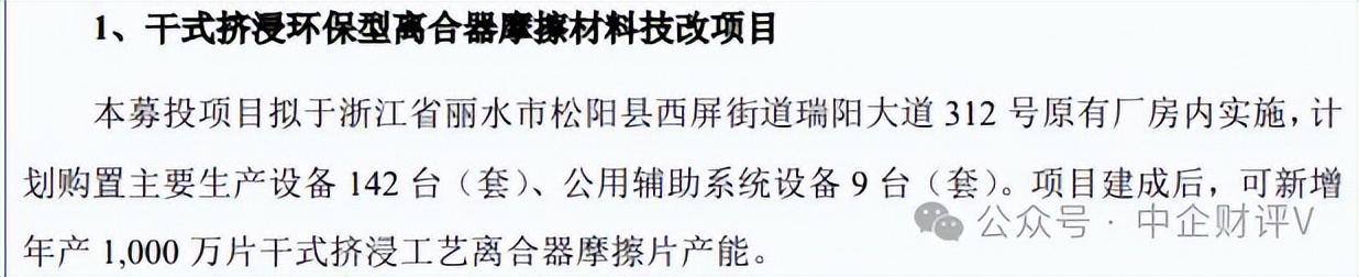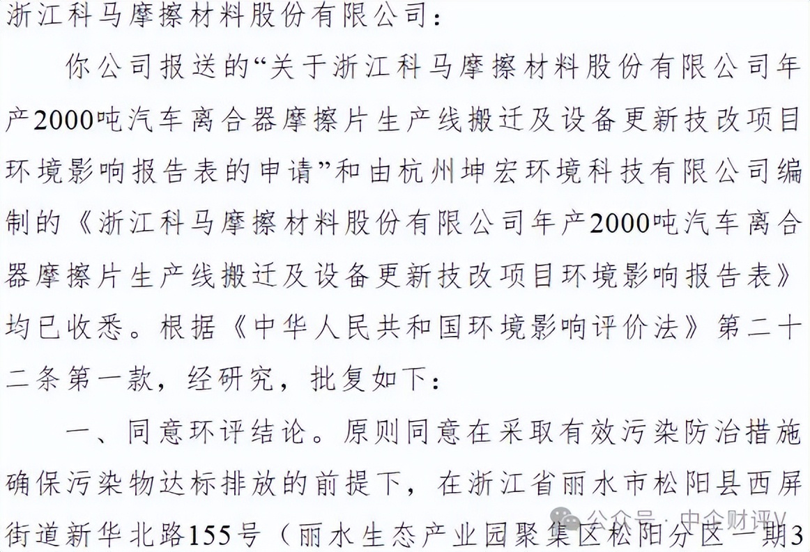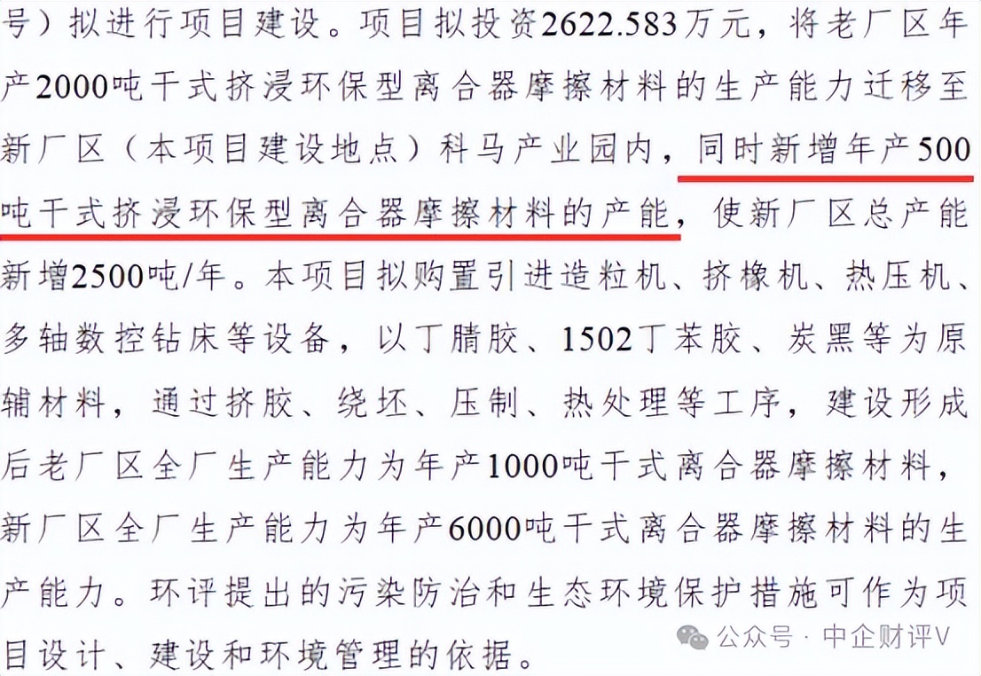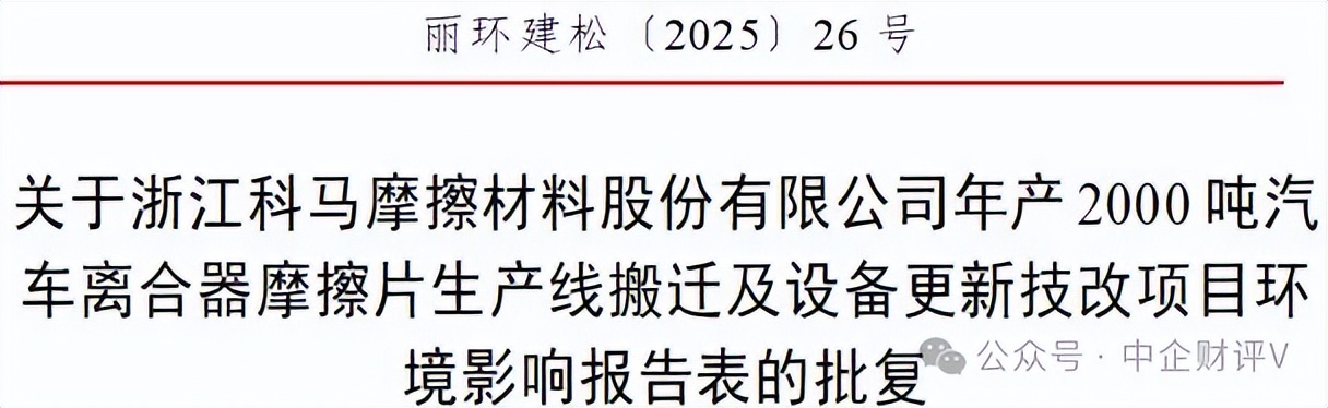 而据据丽水市生态环境局文件丽环建松〔2025〕26号公示,科马材料年产2000吨汽车离合器摩擦片生产线搬迁及设备更新技改项目环境影响报告表的申请获得批复通过,该项目投资2623万元,建成后新增500吨干式挤浸环保型离合器摩擦片产能。