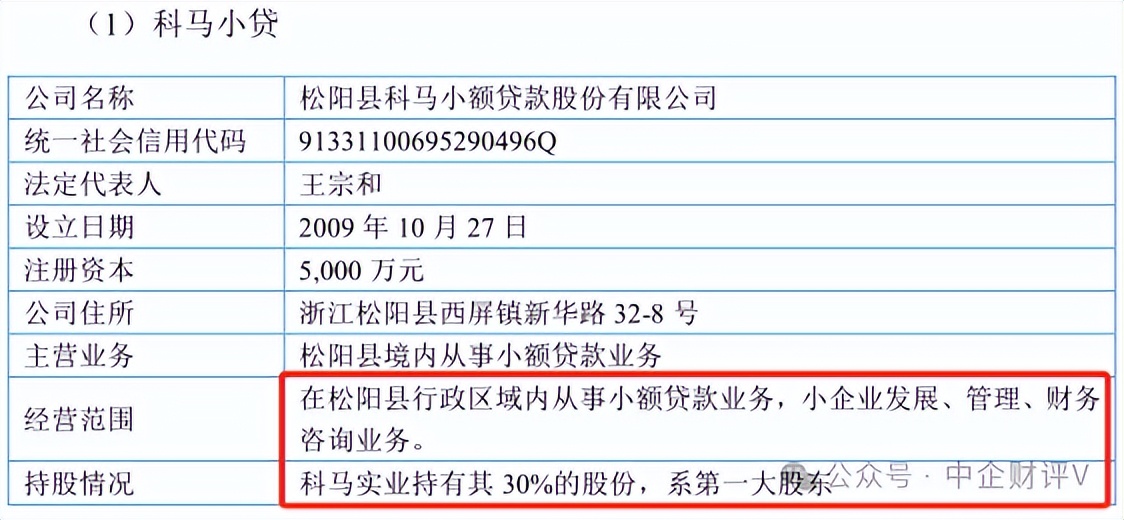 招股说明书(上会稿)显示,科马材料实际控制人王宗和名下存在一家名为“松阳县科马小额贷款股份有限公司”(简称“科马小贷”)的重要参股企业,其中科马材料控股股东“科马实业”持有其30%股份,为第一大股东。