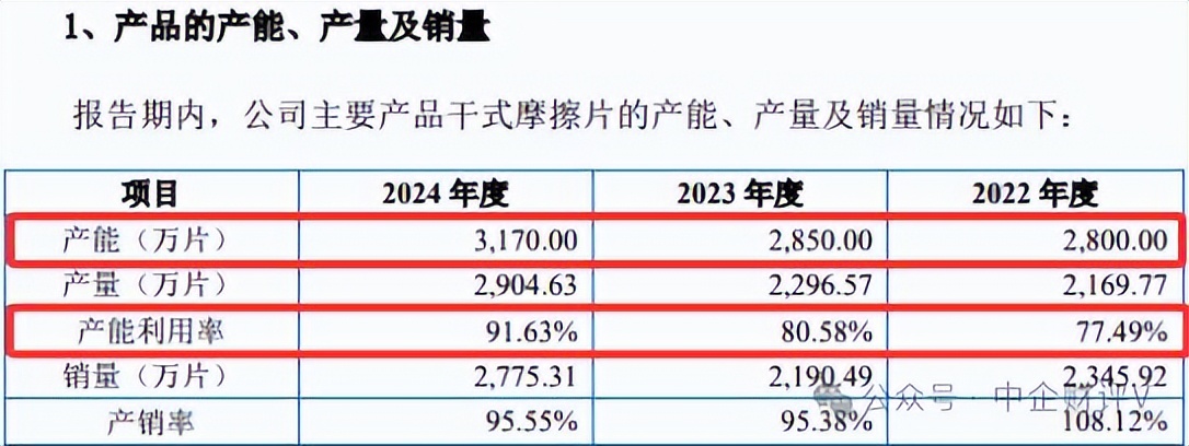 招股说明书披露,科马材料主要产品为干式摩擦片,2022年-2024年(简称“报告期内”)的产能分别为2800万片、2850万片、3170万片,产能利用率分别为77.49%、80.50%、91.63%。